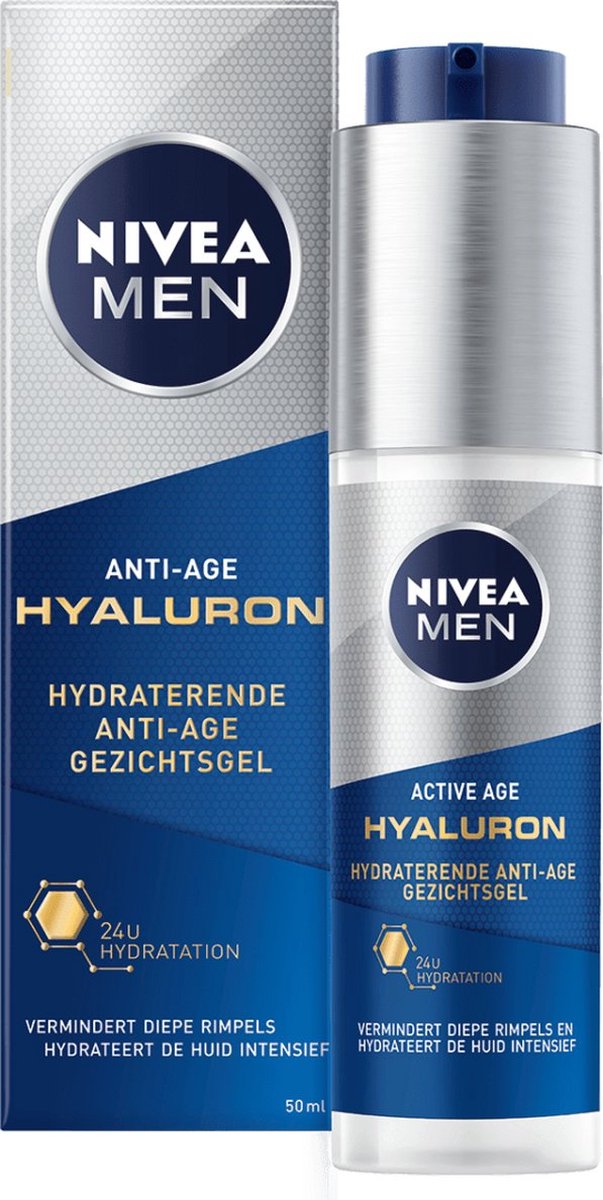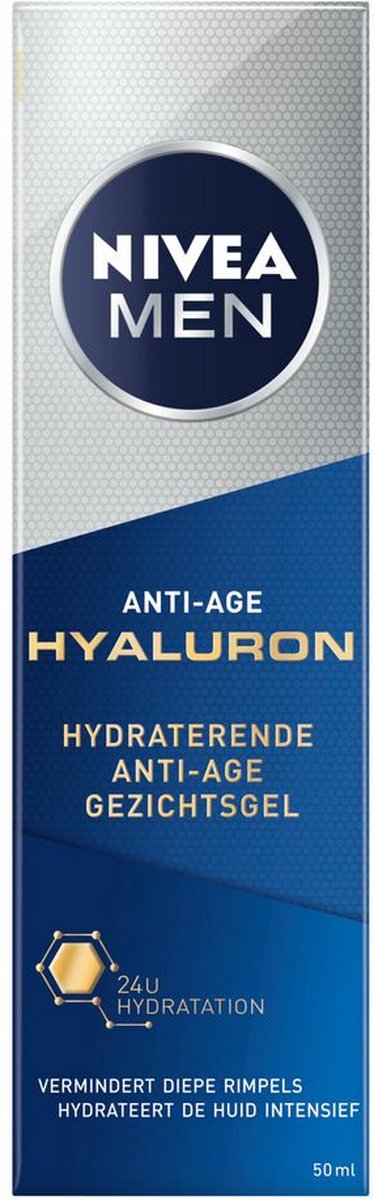 NIVEA MEN Hyaluronzuur Anti-Age Gezichtsgel biedt mannen een gerichte oplossing voor veroudering en vochtarmoede. Deze lichte gel bevat een hoge concentratie hyaluronzuur, een natuurlijke vochtbinder die diep in de huid dringt zonder een vettig residu achter te laten. De formule straffes de huid, vermindert zichtbare rimpels van binnenuit en levert tot 24 uur aanhoudende hydratatie. Speciaal ontwikkeld voor normale tot rijpe mannenhuid, combineert deze anti-age gel effectieve vochtinbreng met een verfrisend, revitaliserend effect. Dermatologisch getest en goedgekeurd voor dagelijks gebruik.