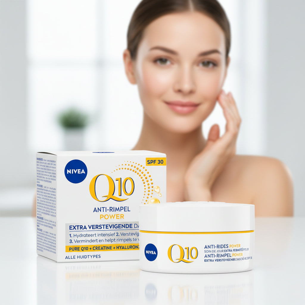 NIVEA Q10 POWER Anti-Rimpel Crème combineert geavanceerde anti-aging technologie met dagelijkse UV-bescherming. De formule met co-enzym Q10 en creatine werkt 24 uur lang tegen rimpels en fijne lijntjes, terwijl het de huid verstevigt en intensief hydrateert. SPF 30 beschermt effectief tegen UVA- en UVB-straling, die voortijdige veroudering veroorzaken. Geschikt voor alle huidtypen, deze dagcrème geeft de huid zichtbaar meer glans en elasticiteit. Dermatologisch goedgekeurd voor veilige, dagelijkse toepassing.